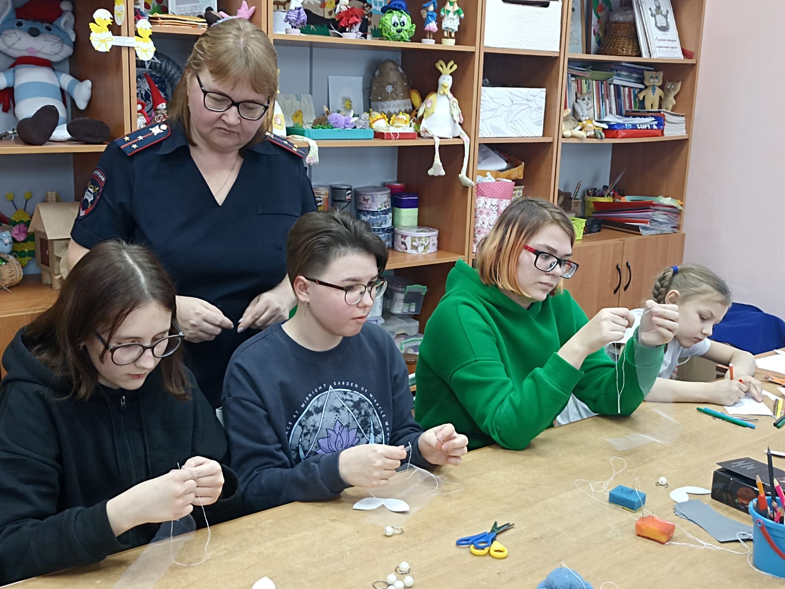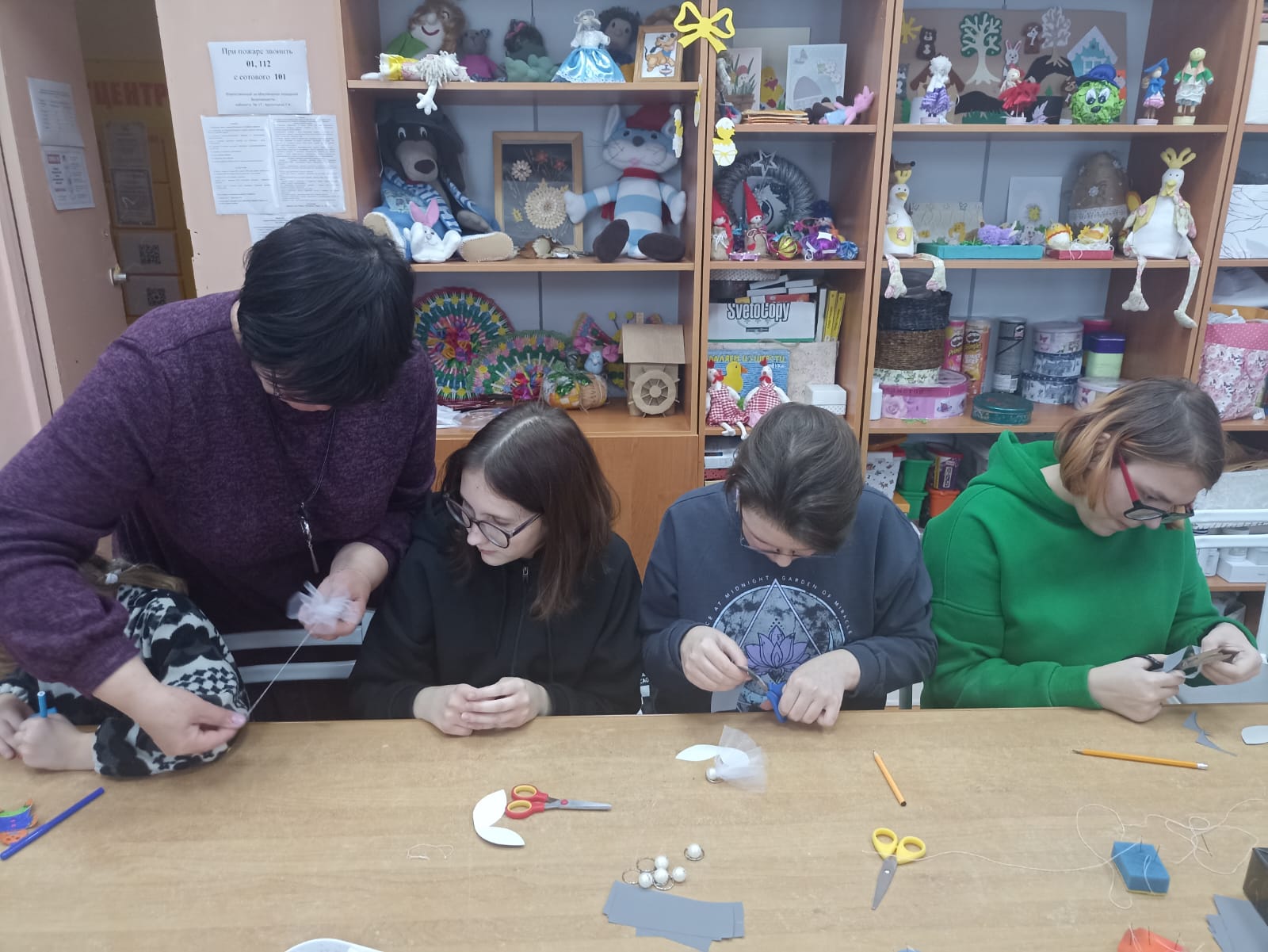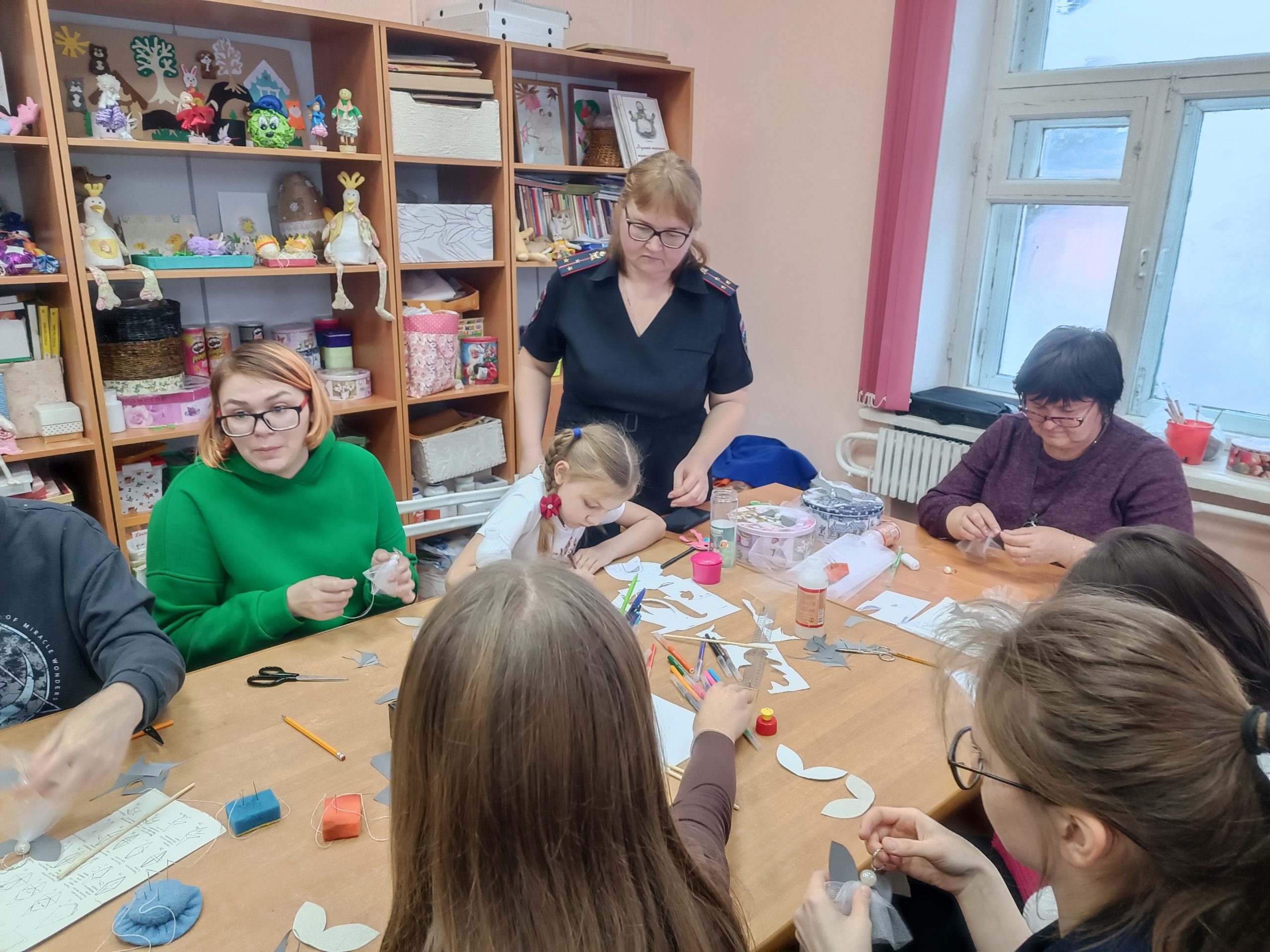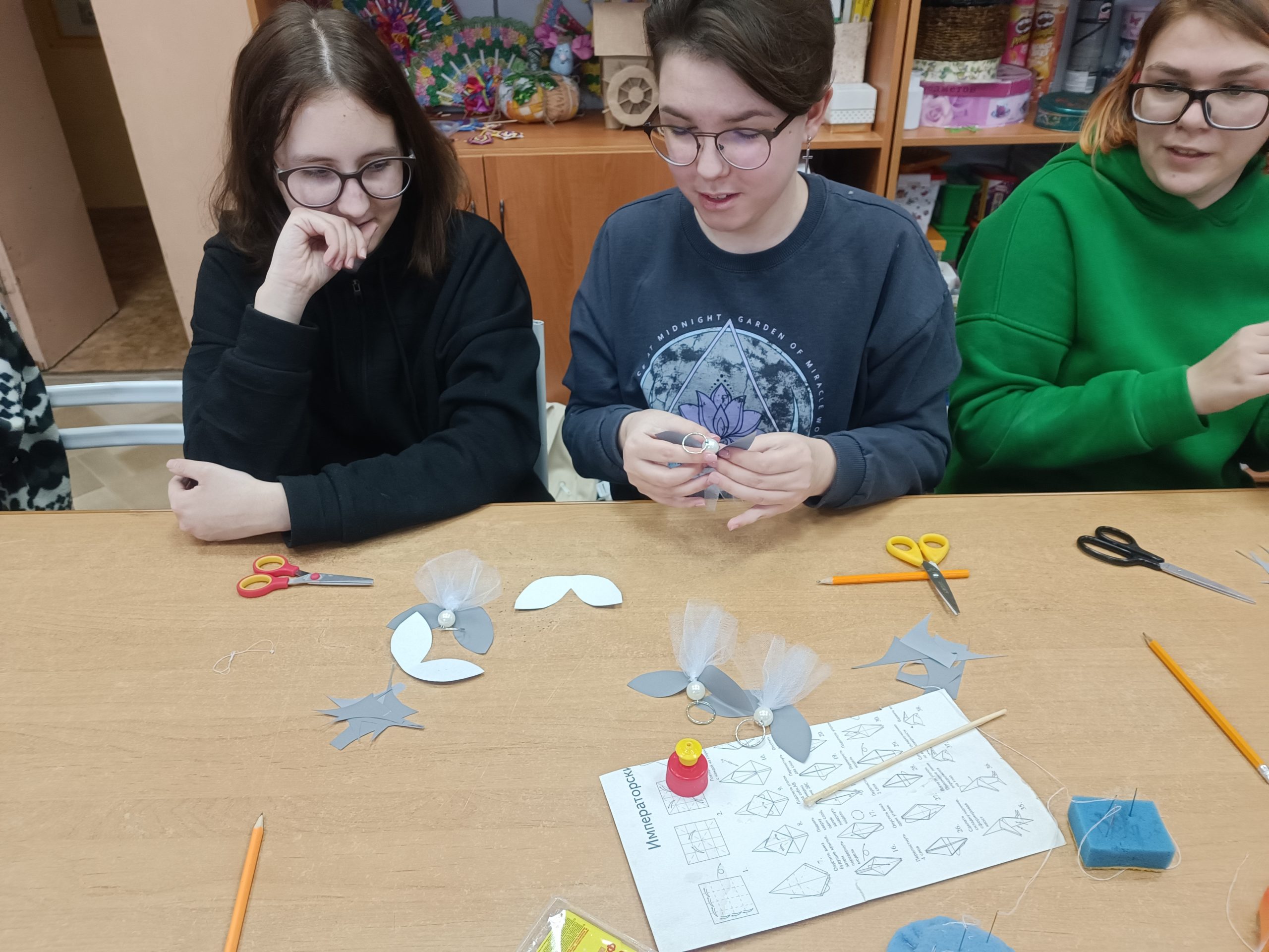 После этого педагог Центра детского творчества Арсентьева Тамара Ивановна провела мастер-класс по изготовлению световозвращающих элементов. Волонтеры из объединений «Педагогический класс» и «Медиа студия», учащиеся из объединения «Театр моды «Золушка» и педагоги, используя световозвращающие материалы, изготовили подвески-фликеры в виде ангелов.