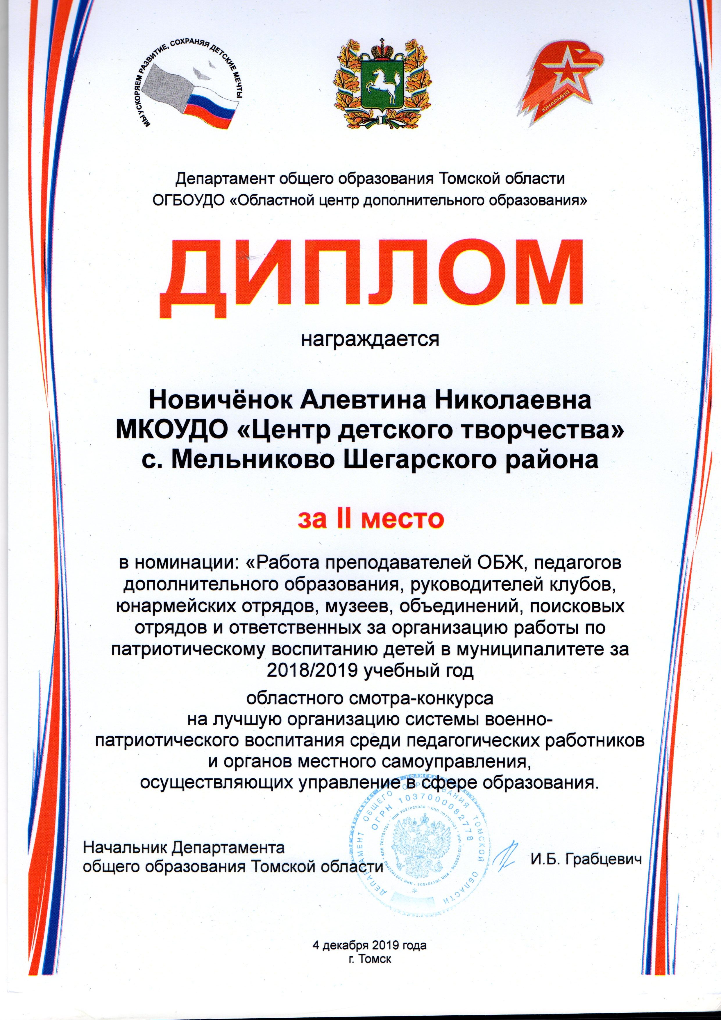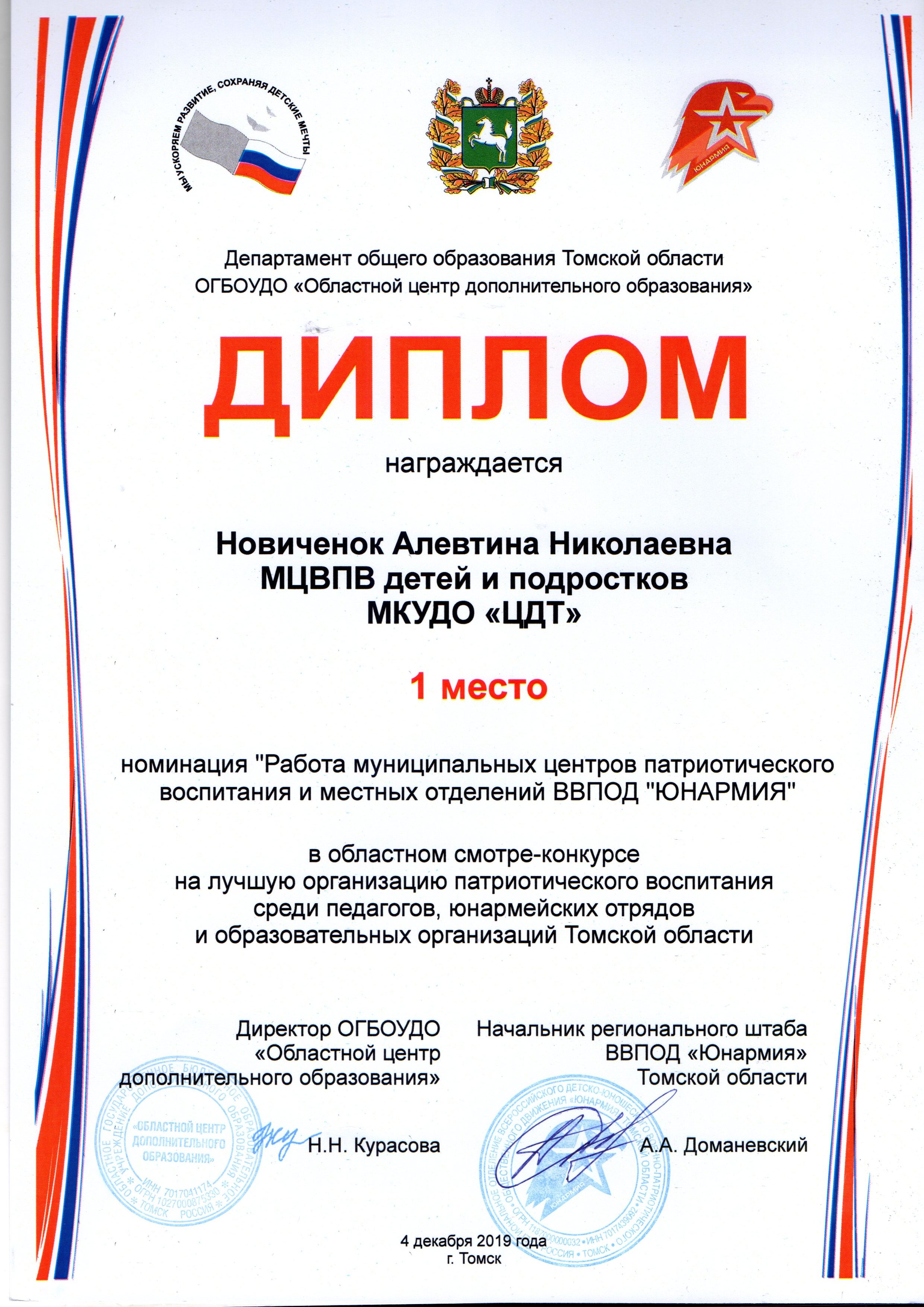 По результатам патриотического воспитания детей и подростков Центр детского творчества в течение 11-ти лет является победителем в Томской области.